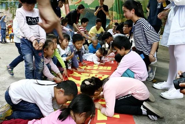 快乐的时光总是短暂。在即将临别之际,微公益社的同学带着孩子们在横幅上画画、签名,小朋友们或画下自己喜欢的哥哥姐姐,或画下自己喜欢的动画片人物。短短的半个下午,孩子们已经喜欢上这些可爱的大哥哥大姐姐们了,分别时依依不舍。爱,在孩子们和为公益社的同学之间火热的传递着。