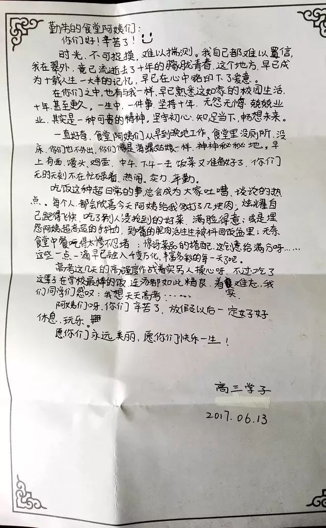 一直以来,为同学们打营养可口的菜品就是食堂师傅们的宗旨。小编突然想起,去年高考结束后,还有一位同学专门给食堂阿姨写了一封感谢信,我们再一起回顾一下吧!