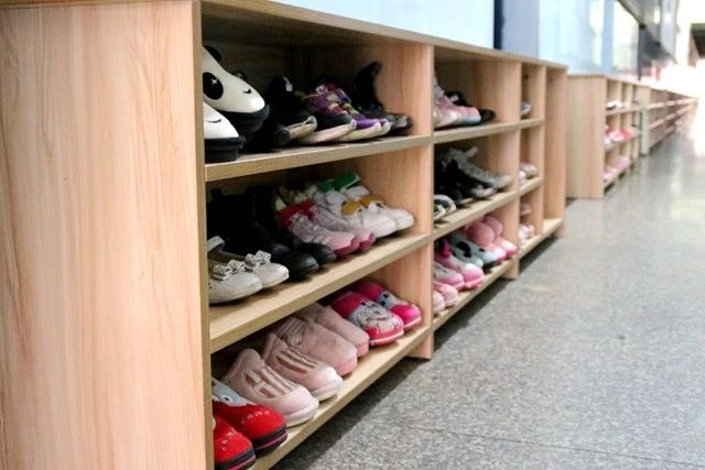 摆放整齐的鞋、生活用品、洗漱用具,寝室是咱家,爱护卫生靠大家。