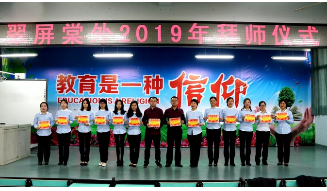 办学十八年来,翠外教师在省级以上的优质课大赛中获得一等奖已达40人次,在市区各类赛课中荣获一、二等奖近300人次,在省、市、区的各级各类讲座、献课中翠外教师早已成为了一道亮丽的风景线,获得了各级领导、专家和同仁的一致好评,堪称创造了教师专业成长的奇迹。翠外精神的传承,翠外未来的命运,还需要更多优秀的青年教师不断成长。今天隆重举行的拜师仪式,就是为了年轻的新老师们能够青出于蓝而胜于蓝,在实现自身专业成长的同时,也为学校的发展创造新的辉煌!