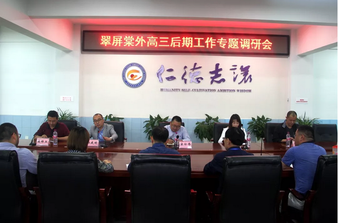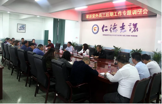 教学楼五楼会议室,翠屏棠外高三后期工作专题调研会在向庆明局长的主持下召开。我校党委书记蒋启安首先就刚刚结束的三诊考试情况,特优生专题培养,高中教师队伍建设,高三后期工作安排向各位领导作了详尽汇报。