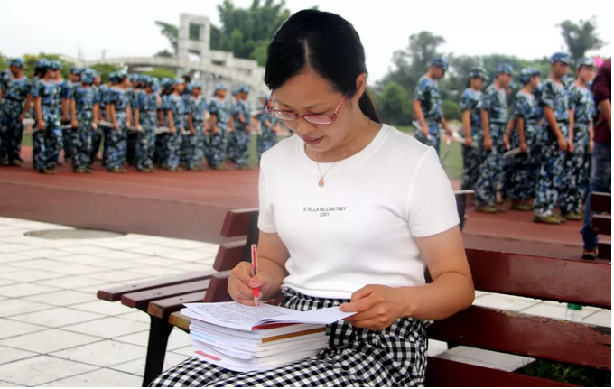 训练场边,老师们一边陪伴着孩子们,一边批改日记